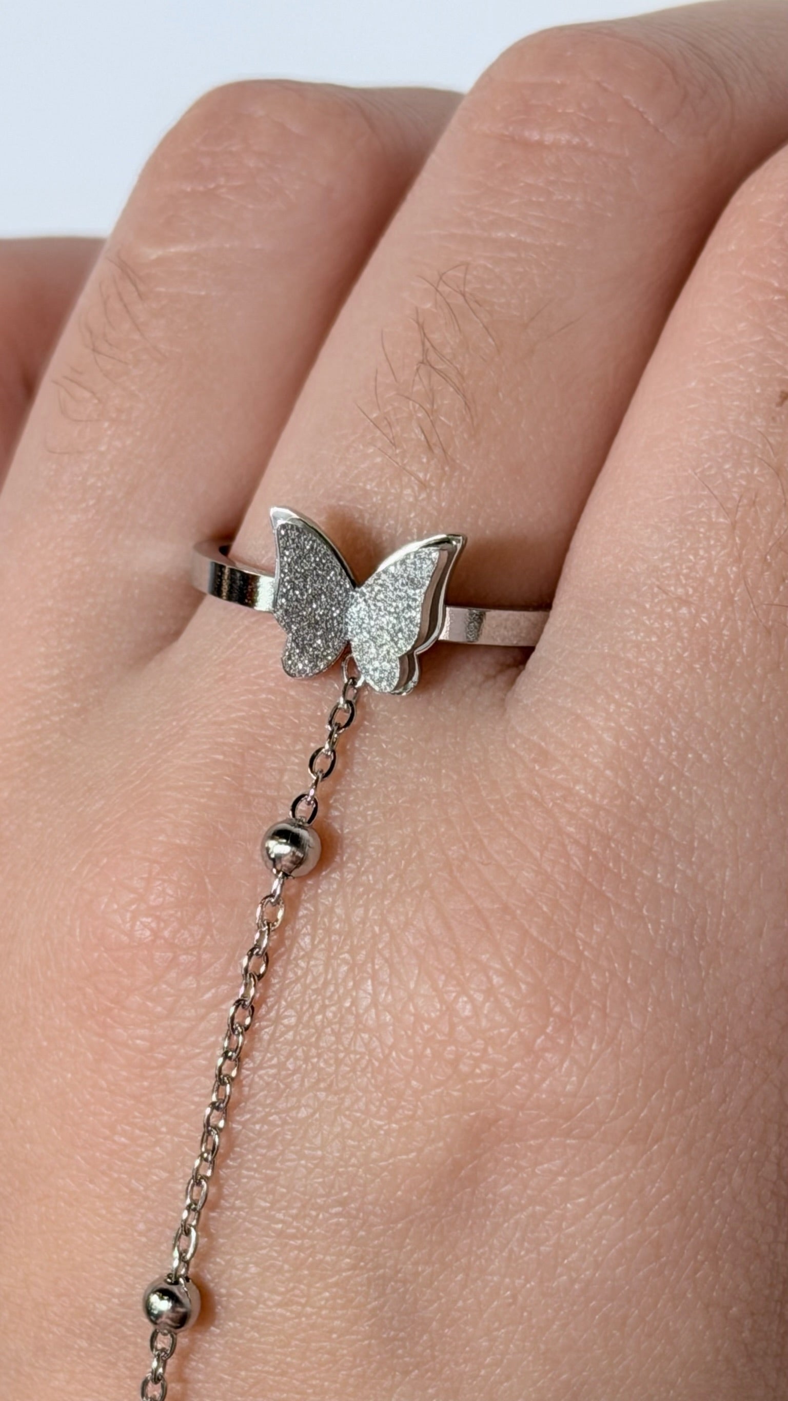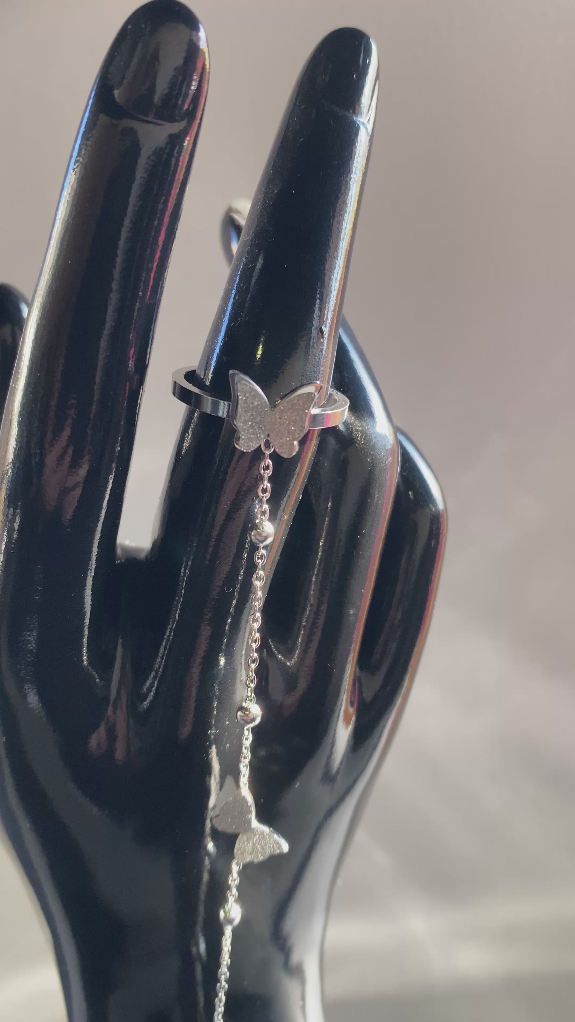 O Anel Bracelete de Borboletas combina pulseira e anel numa peça única que dá destaque às mãos com um visual moderno e marcante. As borboletas trazem brilho elegante e a corrente fina cria um efeito fotogénico. Fica incrível com croppeds, mangas abertas e looks festa onde tu queres um acessório diferente e sofisticado.