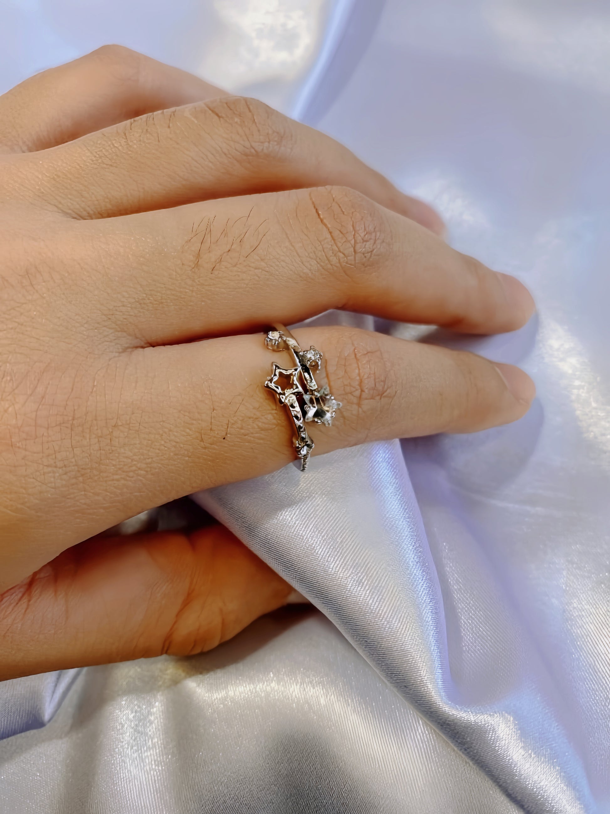 Anel ajustável com diversas estrelinhas alinhadas, criando um visual leve, delicado e com brilho sutil. Ideal para quem ama acessórios temáticos e românticos.