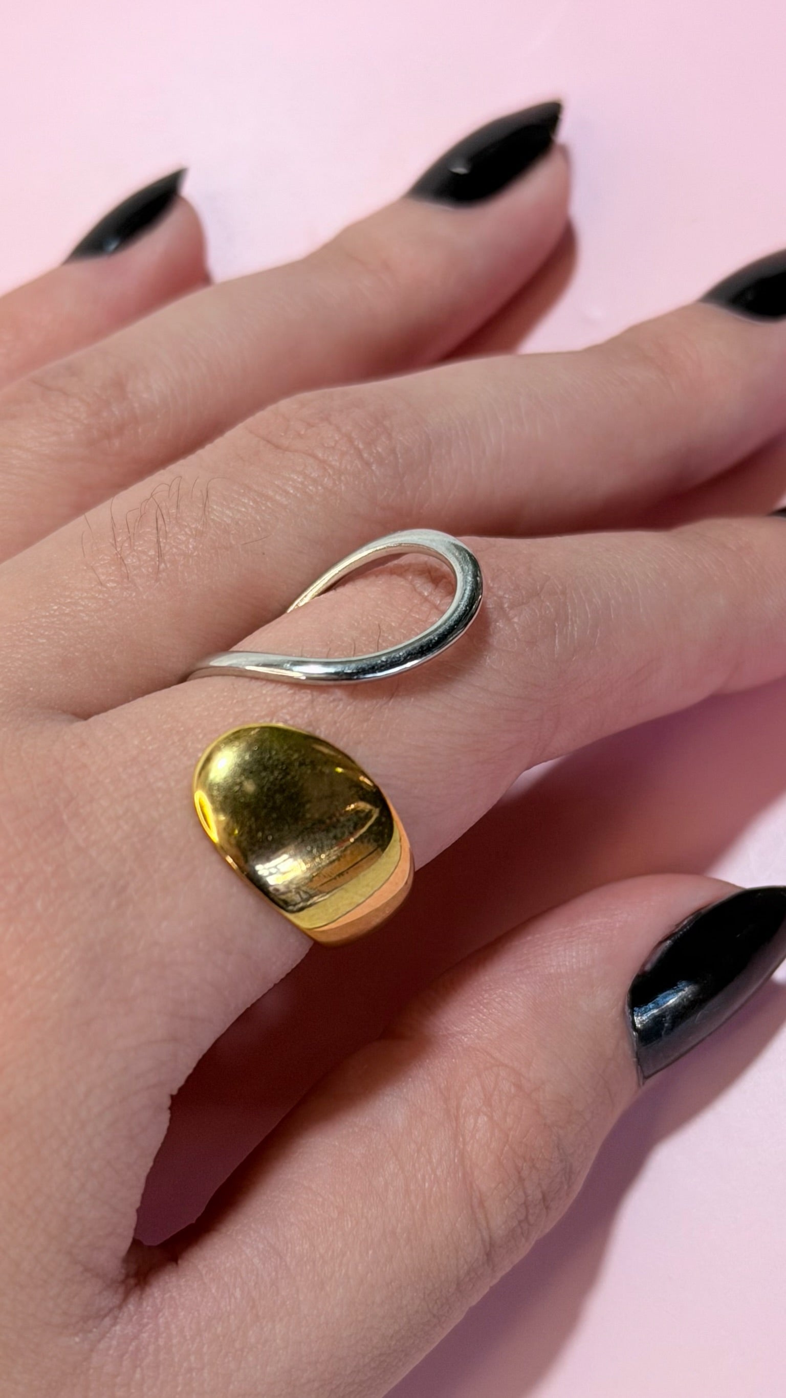 Design artístico com curvas orgânicas e ponta dourada em acabamento polido. É uma peça escultural, moderna e marcante, perfeita para elevar o look com um toque contemporâneo.