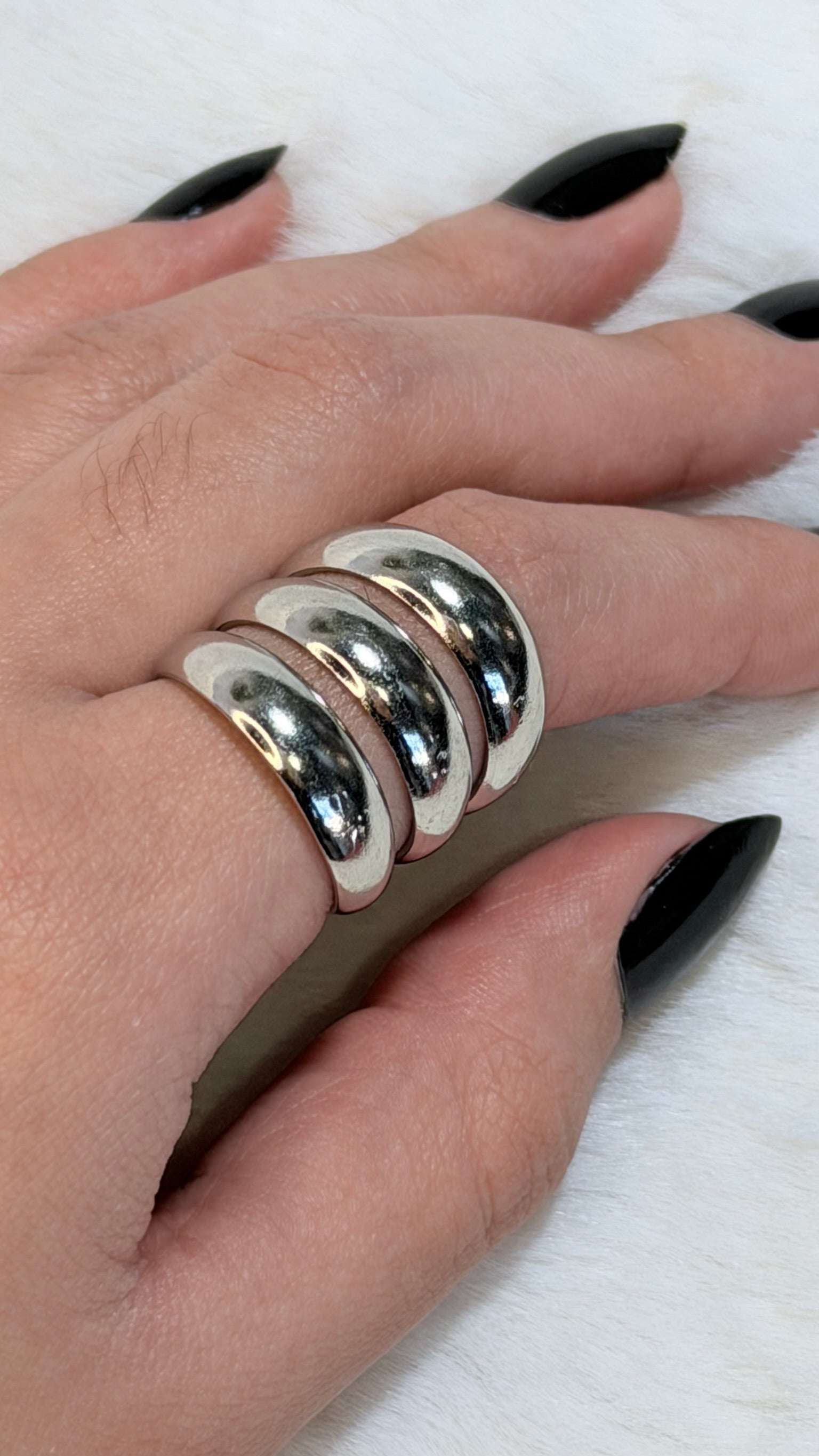 Anel composto por três arcos robustos que criam um efeito bold e moderno. O brilho espelhado dá presença sem perder a elegância.