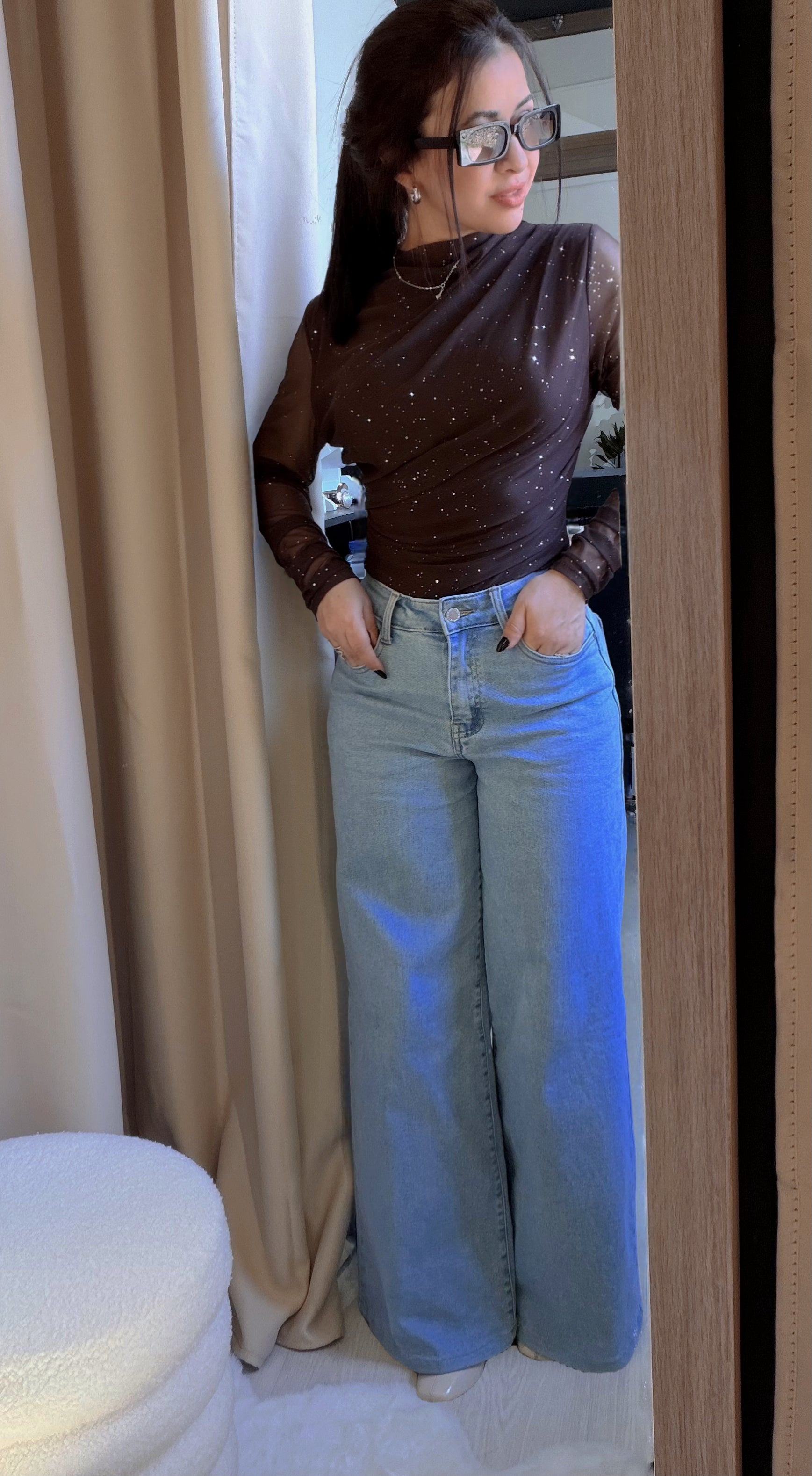 Blusa em tule fino com microbrilhos, de toque suave e elástico, com caimento drapeado frontal que valoriza o colo e a silhueta.