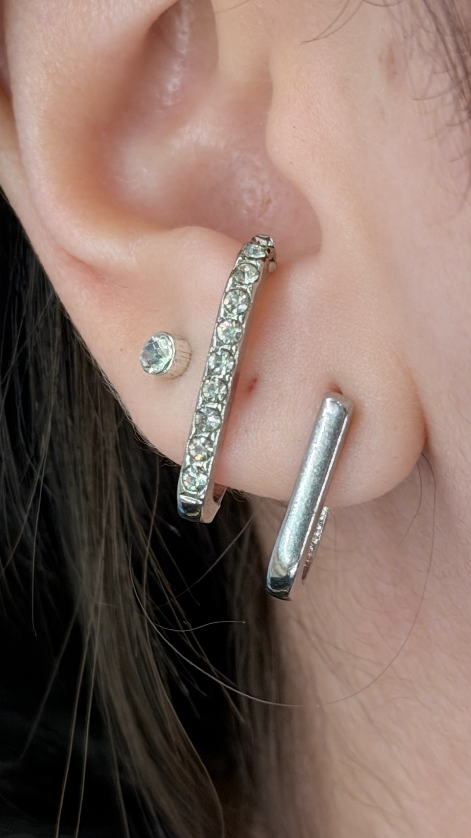 Brinco argola estilo huggie em acabamento prateado, com pedrinhas cravejadas ao longo da peça. Delicado, elegante e com brilho na medida certa, perfeito para quem gosta de acessórios discretos, mas que fazem diferença no look.