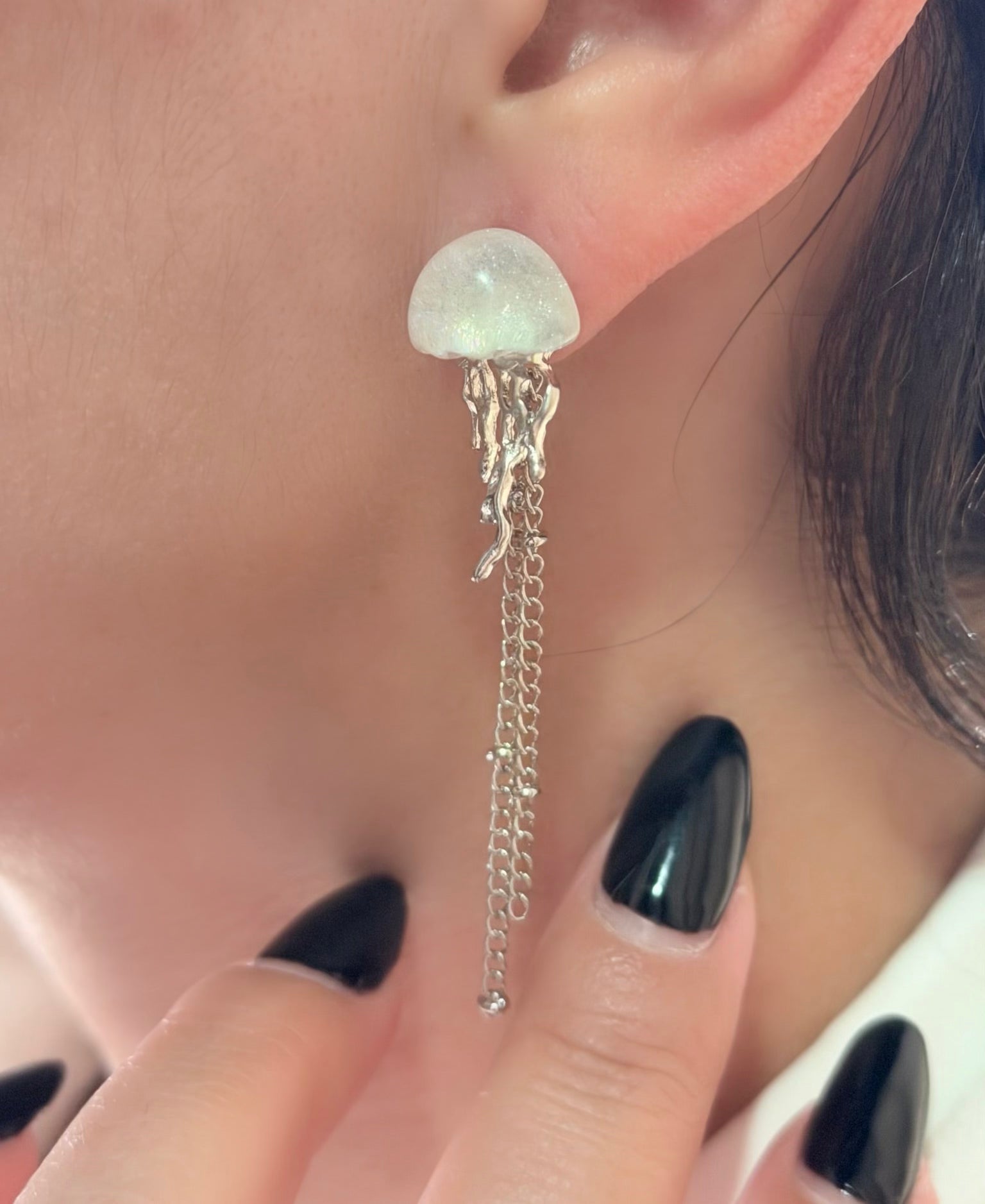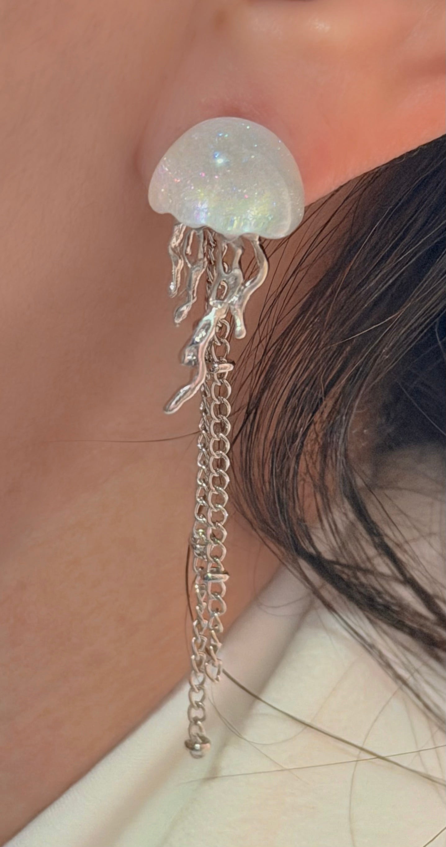 Brinco inspirado em água-viva, com base cintilante e tentáculos metálicos que descem em correntes finas, criando um movimento único e artístico. É uma peça diferente, criativa e cheia de personalidade, perfeito para looks minimalistas que pedem um acessório protagonista.