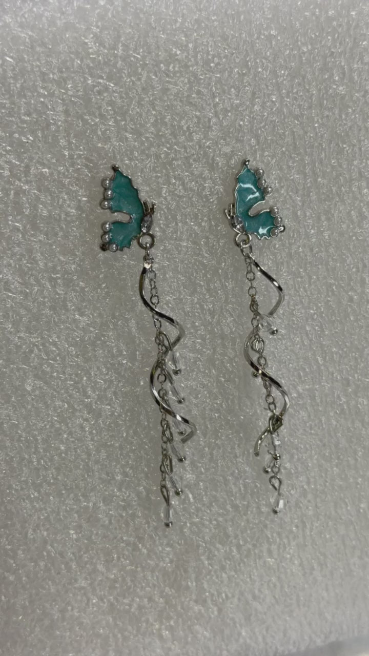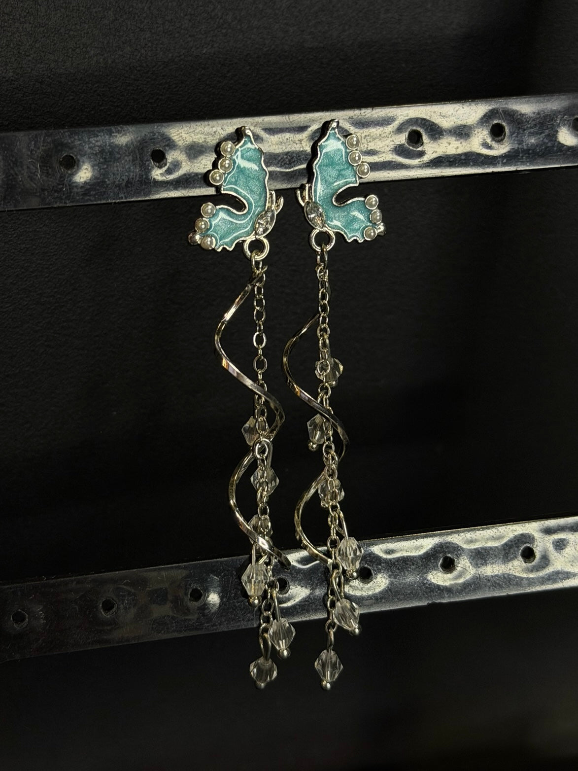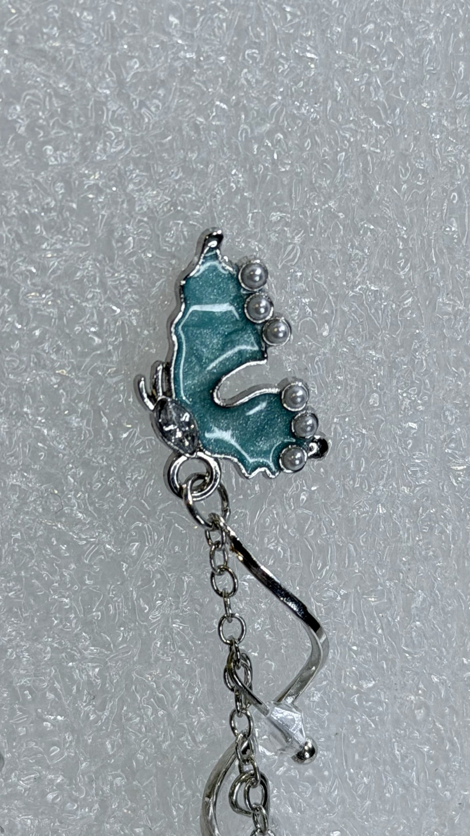 Brincos longos com borboleta em tom azul translúcido, detalhes perolados e correntes com cristais que caem em movimento suave. É uma peça delicada e elegante, perfeita para looks românticos, produções mais femininas ou até para dar um toque de leveza no visual básico.