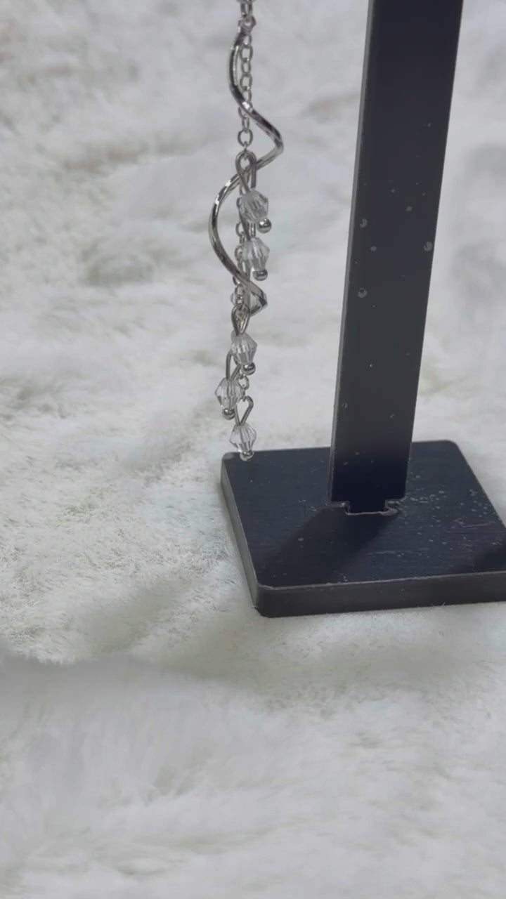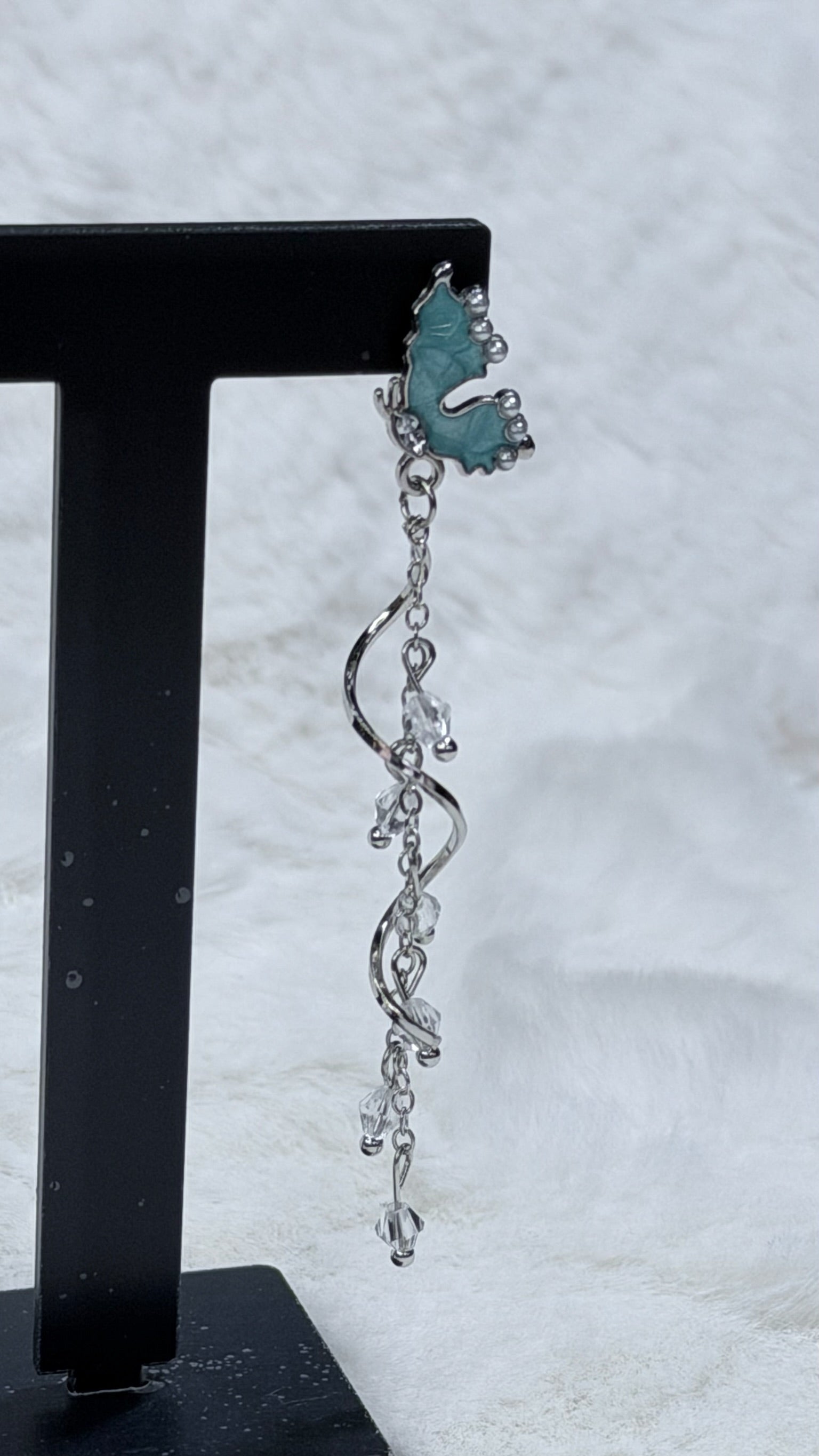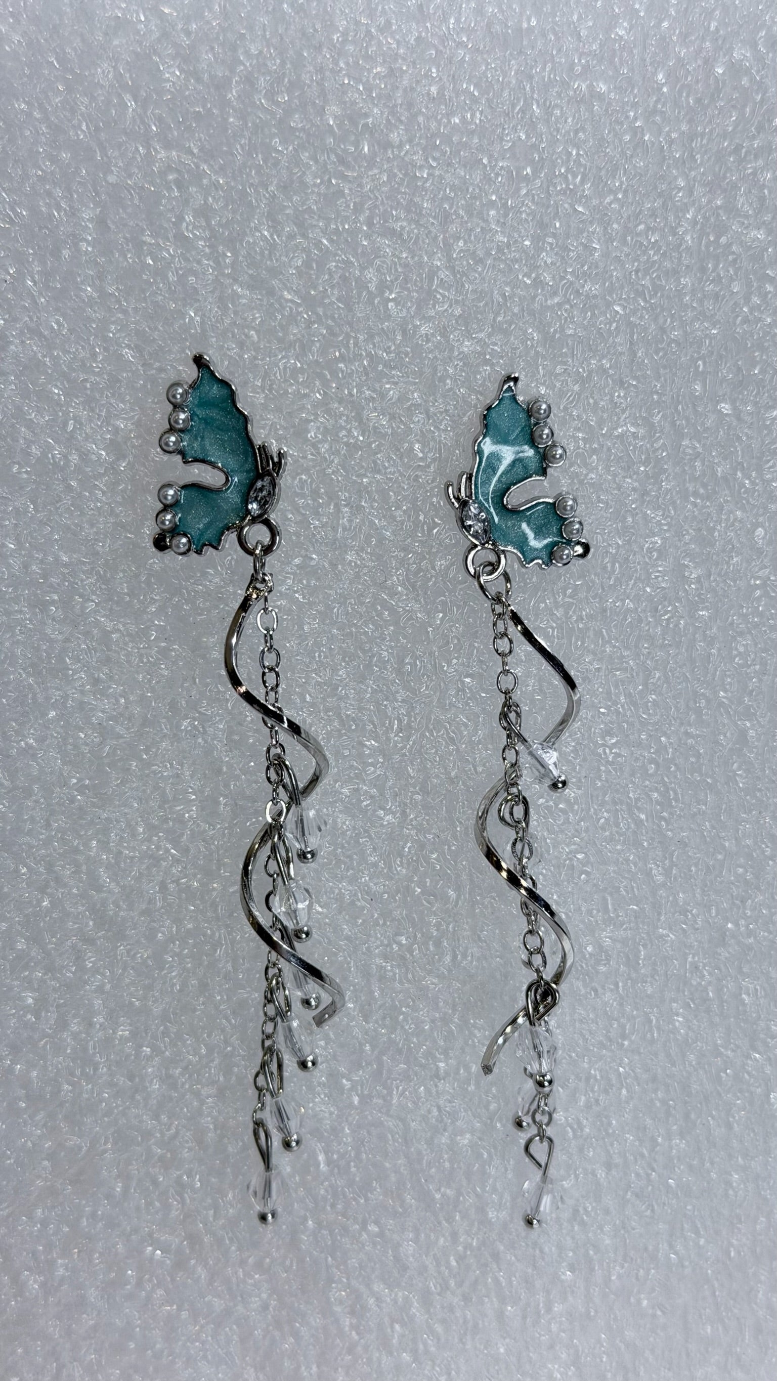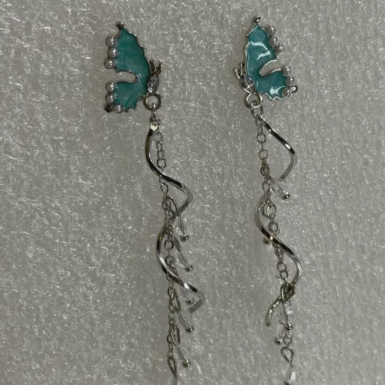 Brincos longos com borboleta em tom azul translúcido, detalhes perolados e correntes com cristais que caem em movimento suave. É uma peça delicada e elegante, perfeita para looks românticos, produções mais femininas ou até para dar um toque de leveza no visual básico.