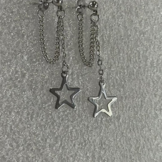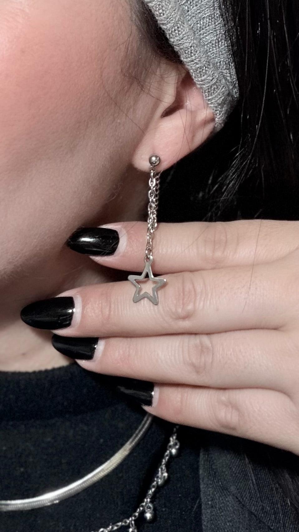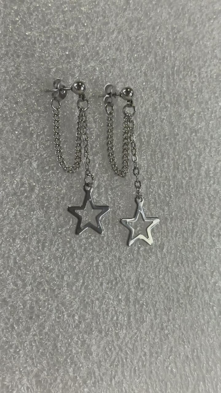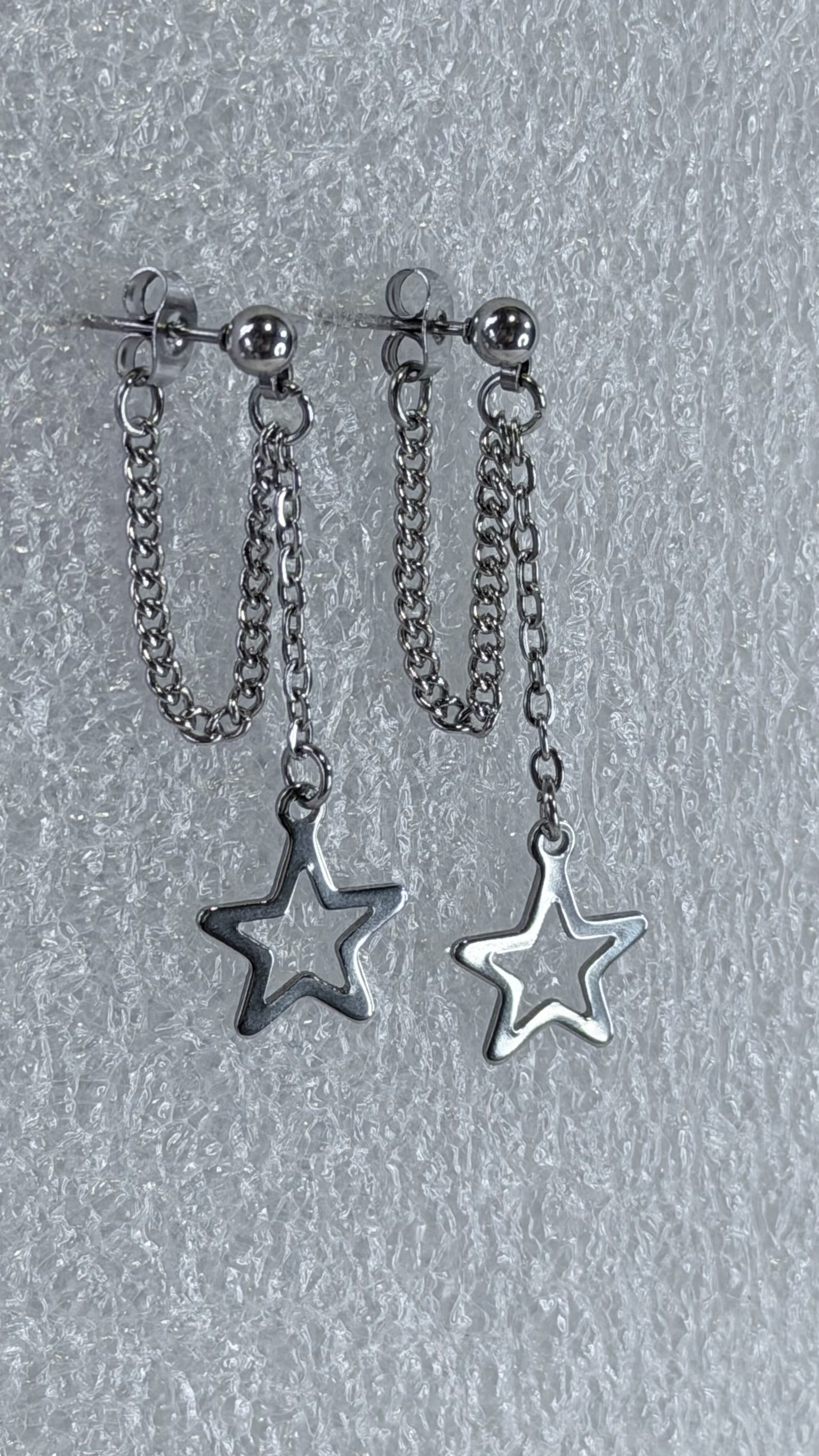 Brincos com base de bolinha, correntes duplas e estrela vazada na ponta. Um modelo leve, moderno e estiloso, ideal para quem gosta de acessórios com personalidade e uma vibe street elegante.