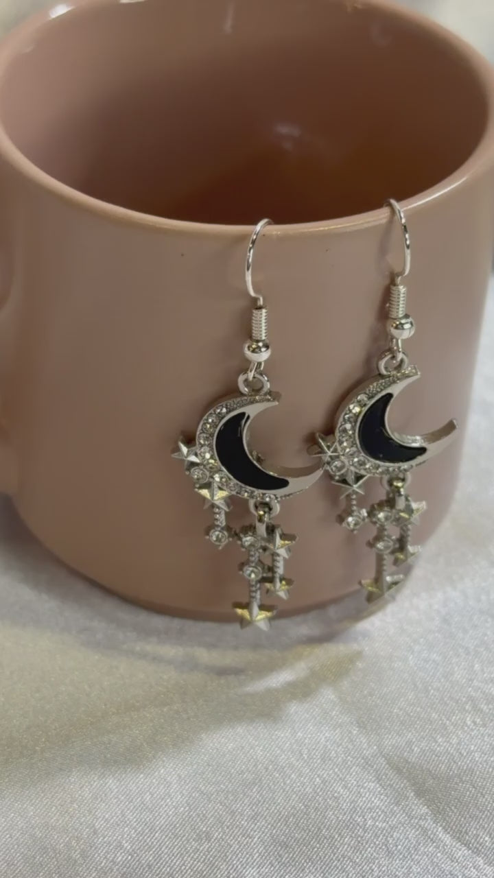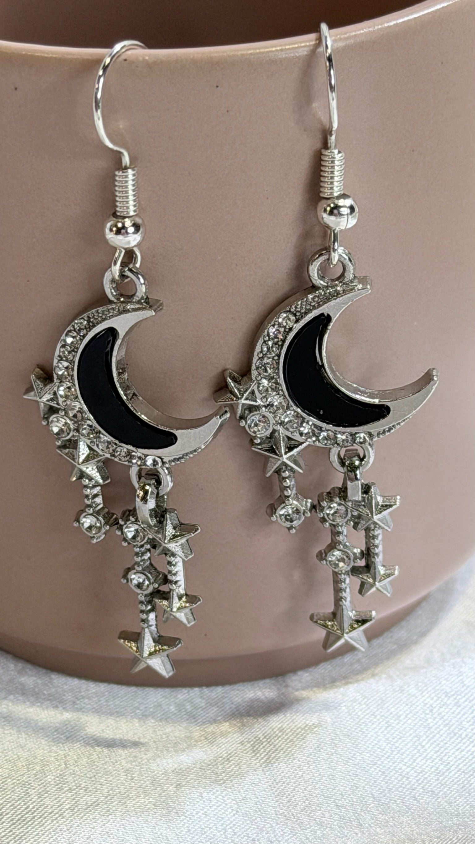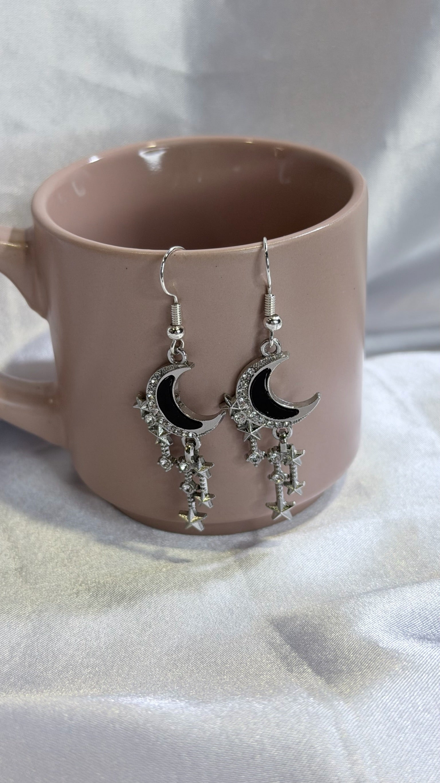 Brincos com meia-lua preta brilhante e estrelas cravejadas, criando um efeito celestial marcante. As correntes com mini estrelas proporcionam movimento e deixam o look mais estiloso, perfeito para quem ama acessórios com vibe mística e moderna.