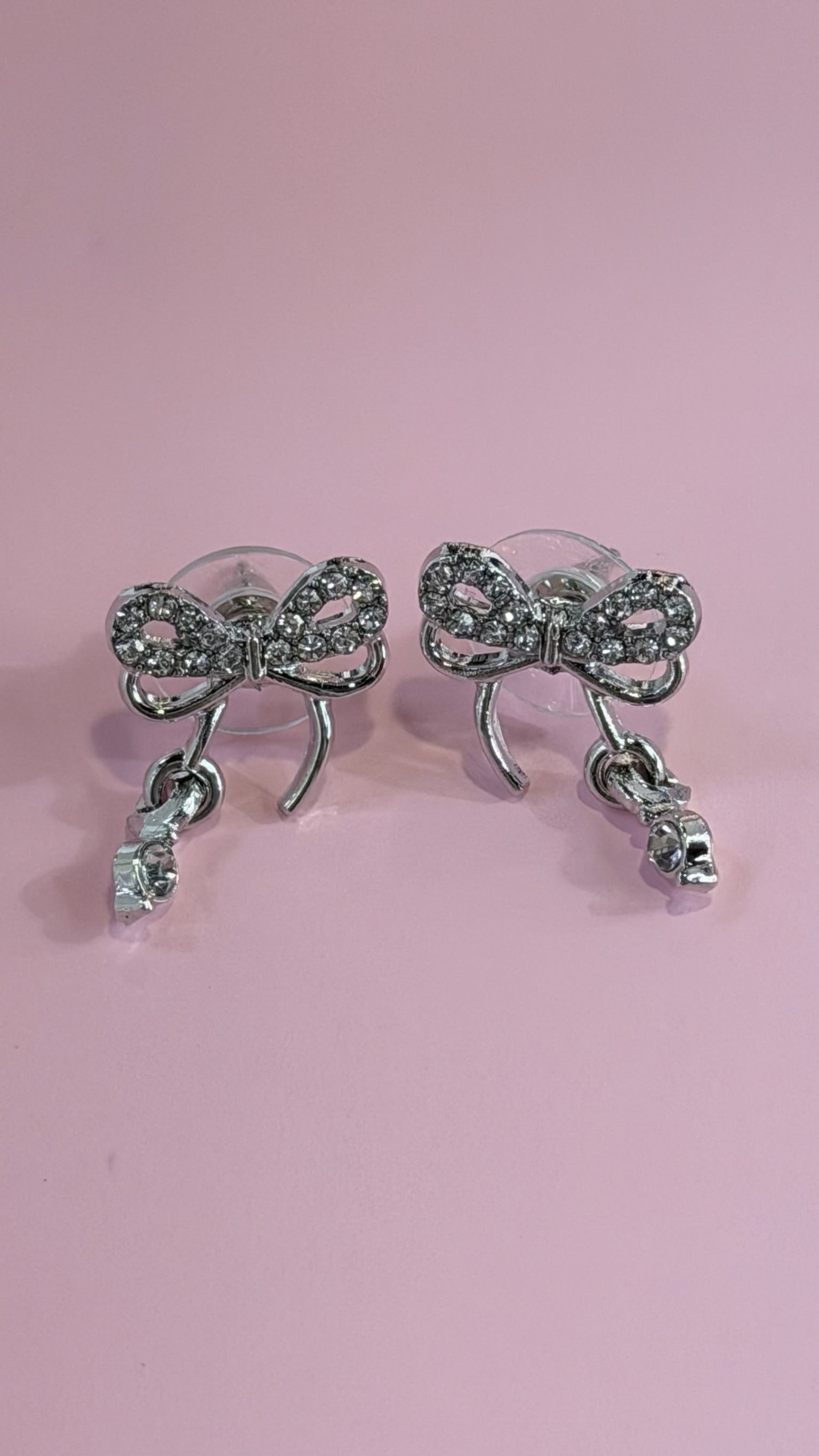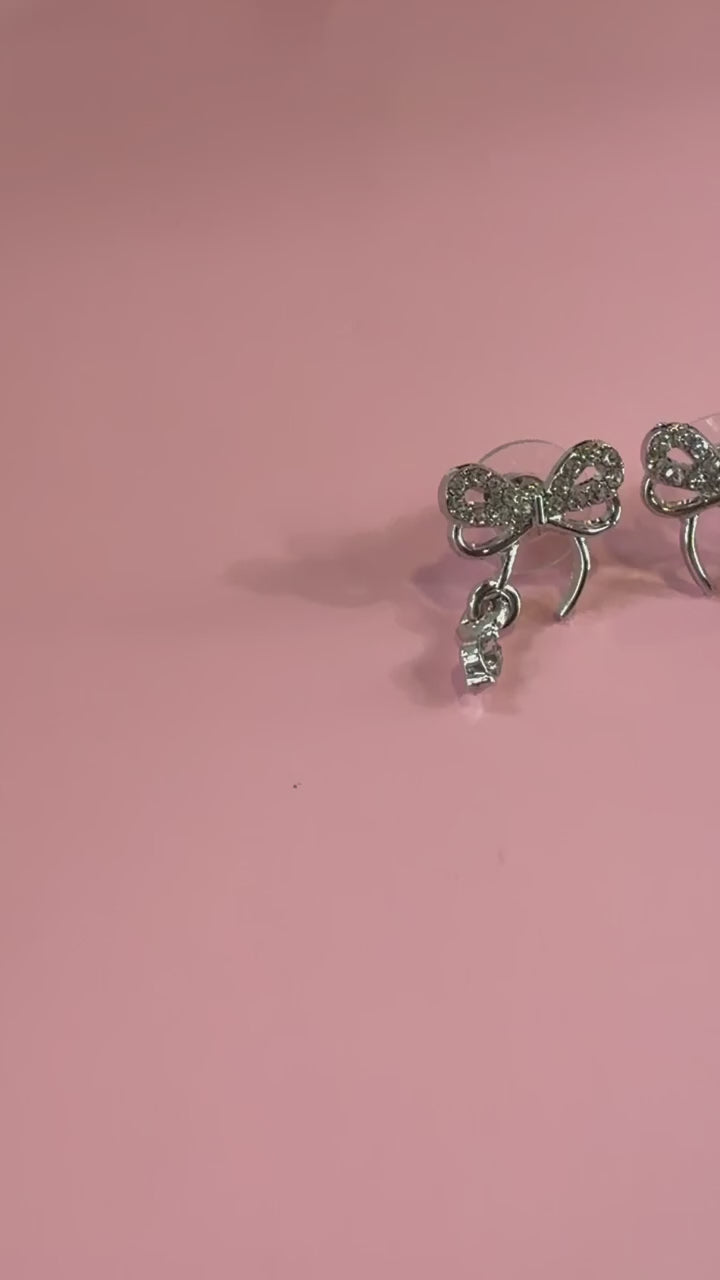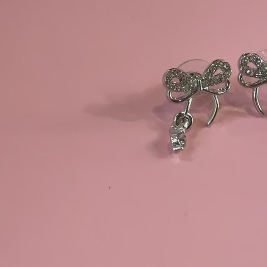 Brincos delicados em formato de laço cravejado, com pingente de strass que traz movimento e brilho sutil. Um acessório romântico e fofo, perfeito para looks leves, vestidos e produções delicadas do dia a dia.