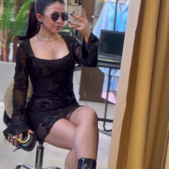 Vestido preto com transparência estratégica e aplicação em renda floral, criando um visual sofisticado e marcante. Modelagem ajustada ao corpo que valoriza a silhueta, com mangas longas em tule leve que trazem elegância e sensualidade na medida certa. O equilíbrio perfeito entre delicadeza e atitude,ideal para ocasiões noturnas, eventos ou produções mais fashionistas.